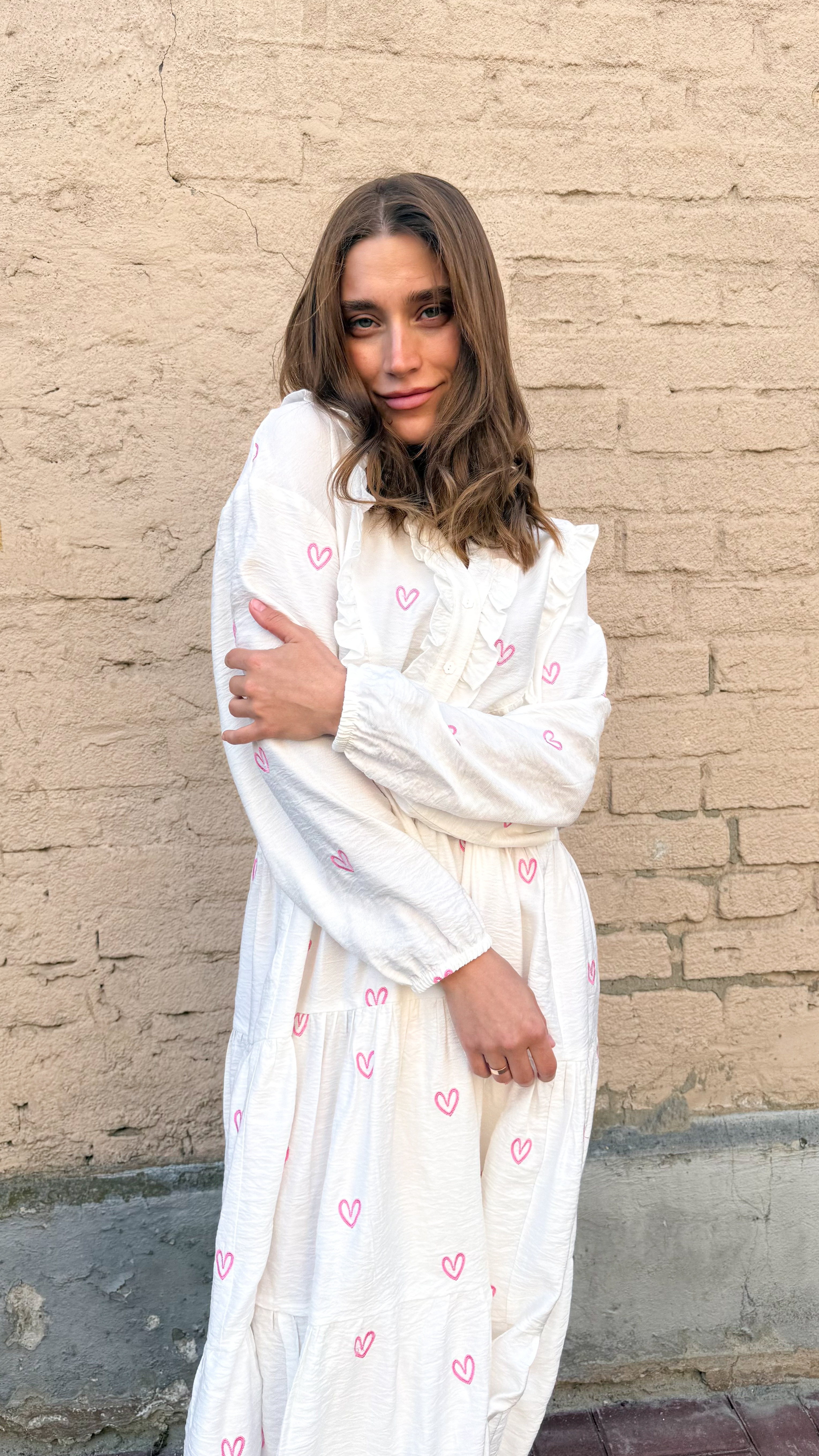 Наше новое платье Bobbi - это маленькое чудо, сотканное из мягкой вискозы и украшенное милыми вышитыми сердечками и кокетливыми воланами.