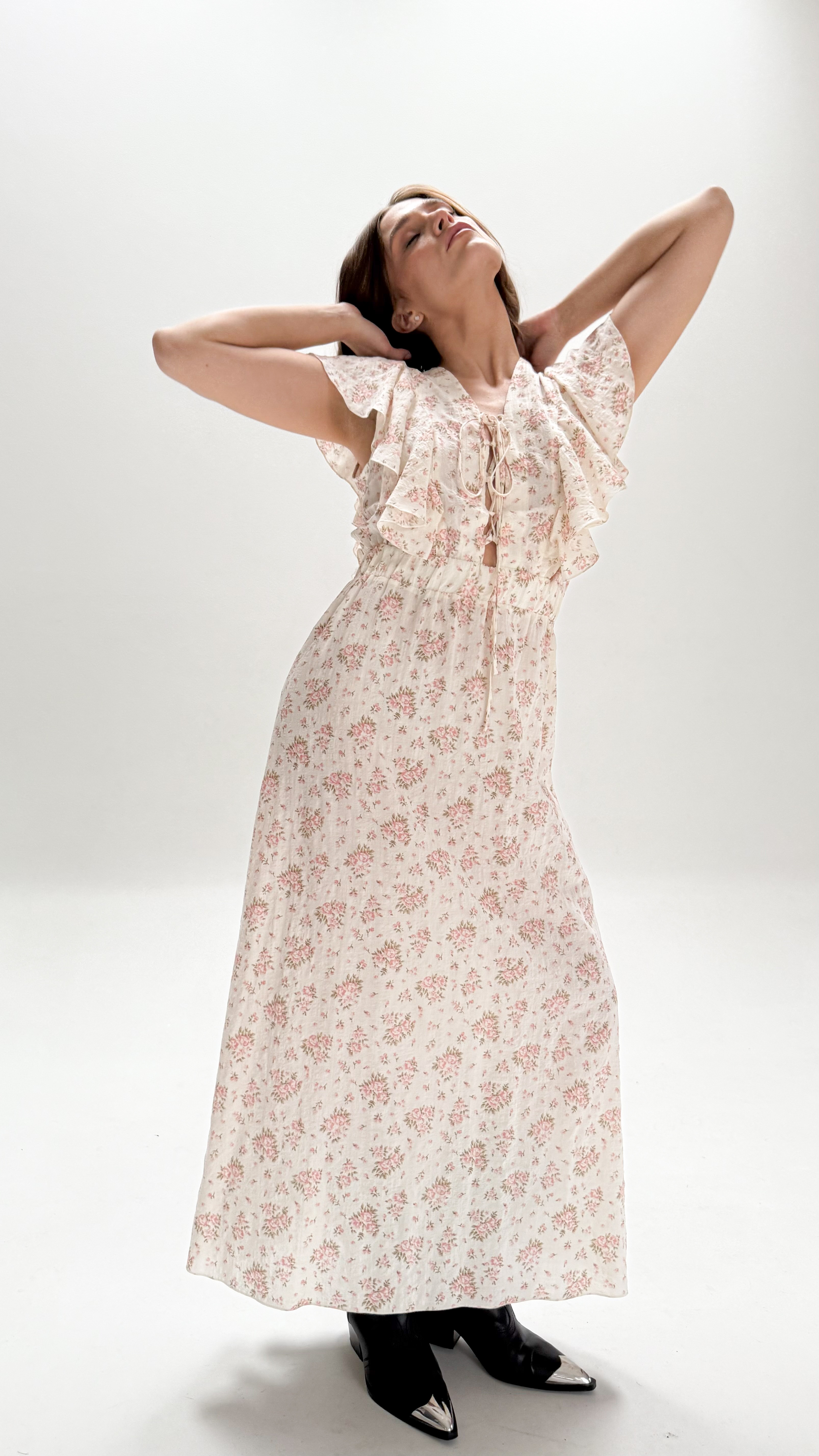 При создании этого платья Nora мы вдохновлялись природными мотивами и летом! Аромат полевых цветов, порхание бабочек и голубое небо... и именно такое ощущение мы чувсвуем надевая его. Легкий цветочный принт, игривые завязки и рукавчик-крылышко наполнят Ваш день романтичным настроением и комфортом.